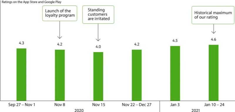 The loyalty program’s launch for all guests didn’t go as smoothly as hoped. We had replaced the old loyalty program’s cashback offer program with an expanded “Crowns” bonus points system. At first, guests who’d had a large amount of cashback in the old program did not understand the way the new one worked. Because of this particular outcome, our ratings on the App Store and Play Market fell. At the same time, the rest of the indicators remained the same.