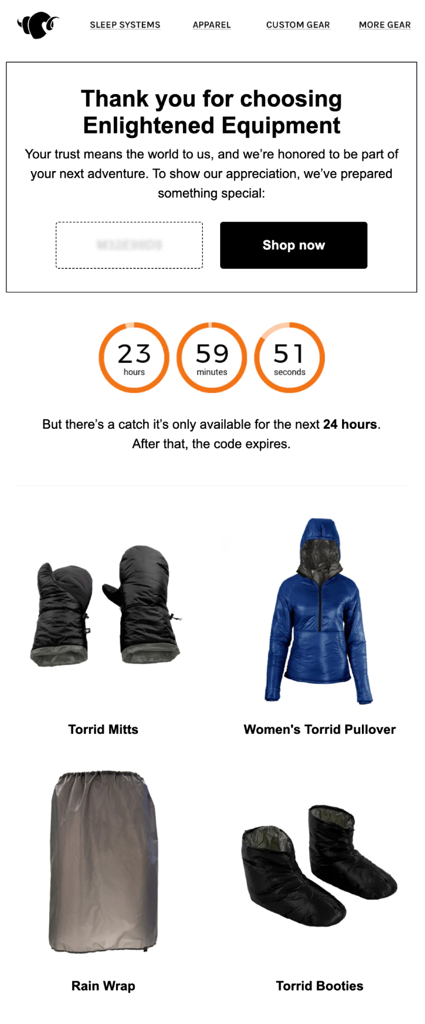 Previously, Enlightened Equipment had only one post-purchase flow: buyers of custom sleeping quilts received a special email sequence to enhance their experience while waiting for production. All other customers got nothing beyond bulk and transactional messages.
