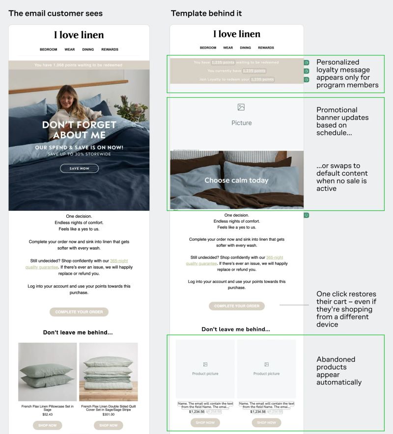 I Love Linen runs regular sales across key flows — from Welcome to Abandoned Category. In Yotpo, each new sale meant manually updating banners and copy in every single email and SMS template.