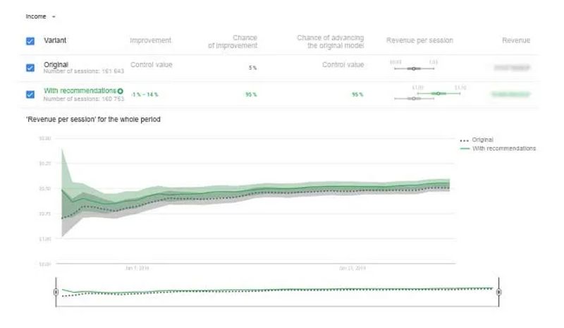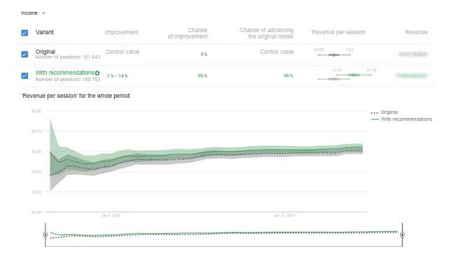 We measured the difference between the two groups after 2 months. According to the results, visitors who saw product recommendations brought in 5.5% more revenue with a statistically significant probability of 95%. At INCANTO’s request, we are unable to disclose exact figures. In the screenshot below, you can see that the value of a control group session is $0.95-1.05, while for the main group, who were displayed product recommendations, it was $1.05 — $1.10.