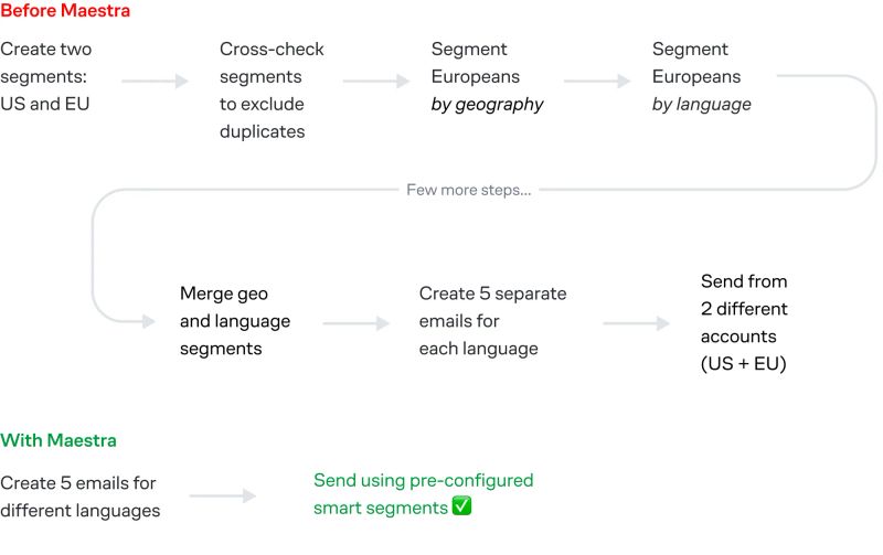SolutionsConsolidated email operations with Maestra’s unified platform, gaining: • One campaign management and customer segmentation hub for US and EU markets• Single flows with automatic language routing• Smart content personalization