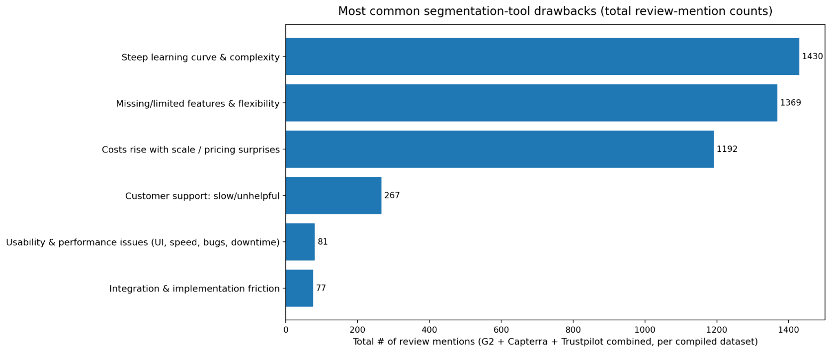 We’ve dug through popular segmentation tools reviews on G2, Capterra, and Trustpilot, and here are the biggest deal-breakers (that sales won’t tell you about):