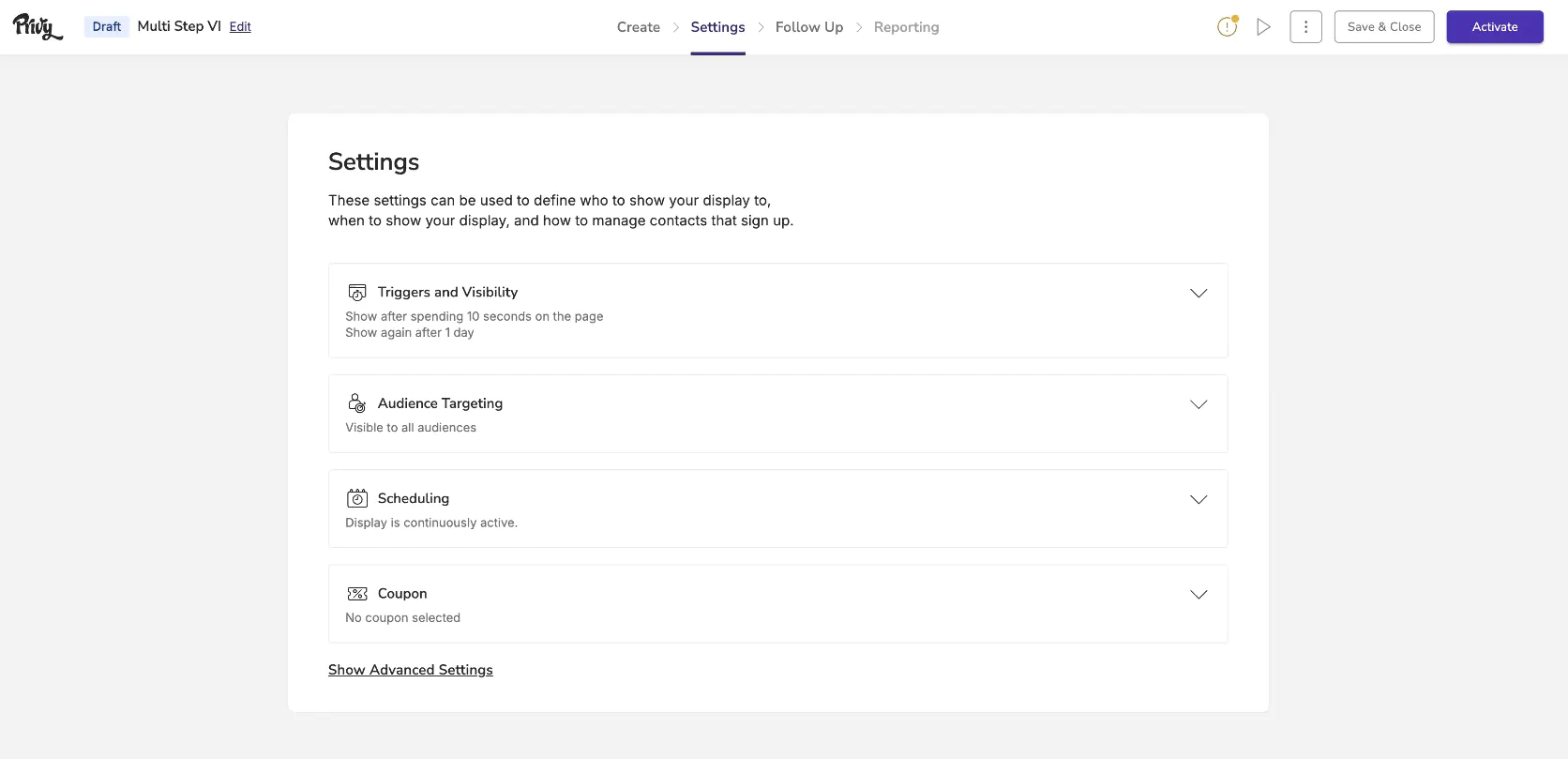 BDOW has various popup formats like welcome mats, scroll boxes, smart bars, and exit-intent popups. Businesses can display forms based on specific URLs, devices, referring websites, visitor behavior, and exit-intent. On top of that, it offers A/B testing functionality to boost conversion rates. Users can integrate with popular marketing tools through direct connections and webhooks to improve their workflow.
