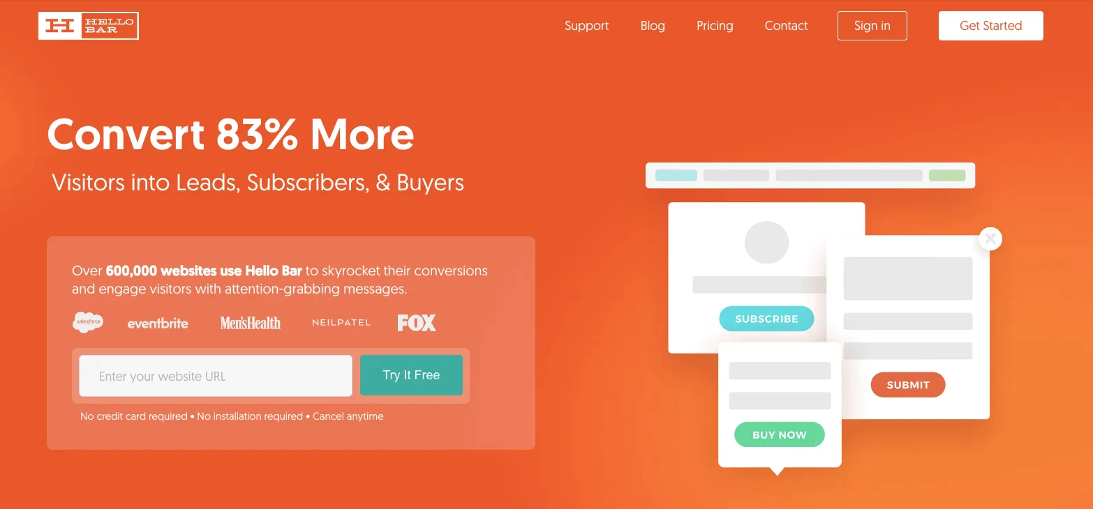 HelloBar enables more than 600,000 websites to connect with visitors through attention-grabbing messages that boost conversions and prompt customer action. This popup tool started as a simple website announcement solution and has grown into a complete conversion platform.