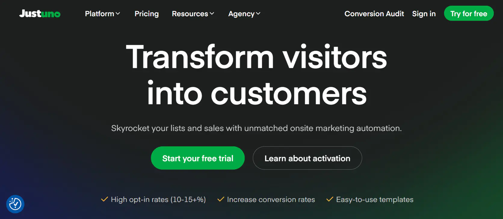 Justuno stands out as a conversion optimization platform that helps businesses convert more existing traffic through intelligent targeting.