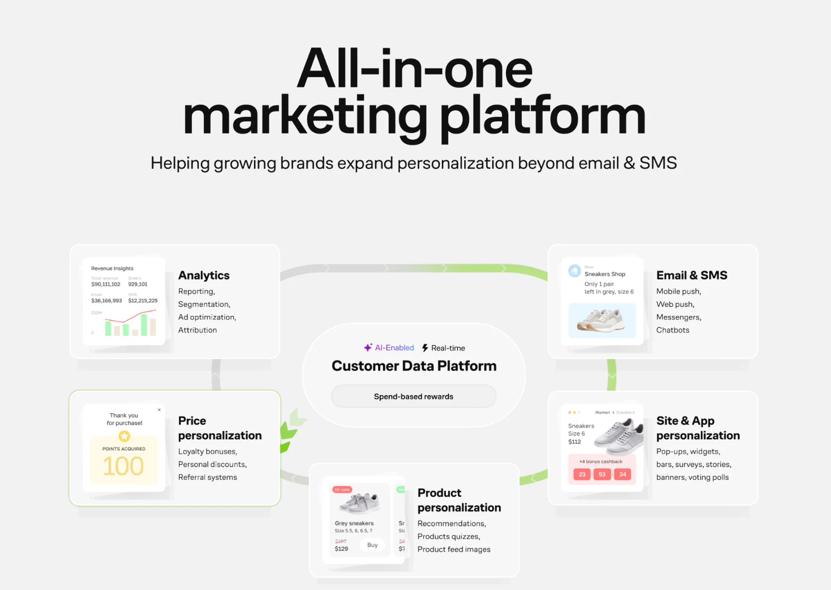 The platform’s AI-powered recommendation engine sits at its core. It personalizes product suggestions through email, web, mobile, and SMS channels. Customer data from multiple sources merges into single profiles. This helps businesses learn about customer behavior patterns and create more relevant recommendations.