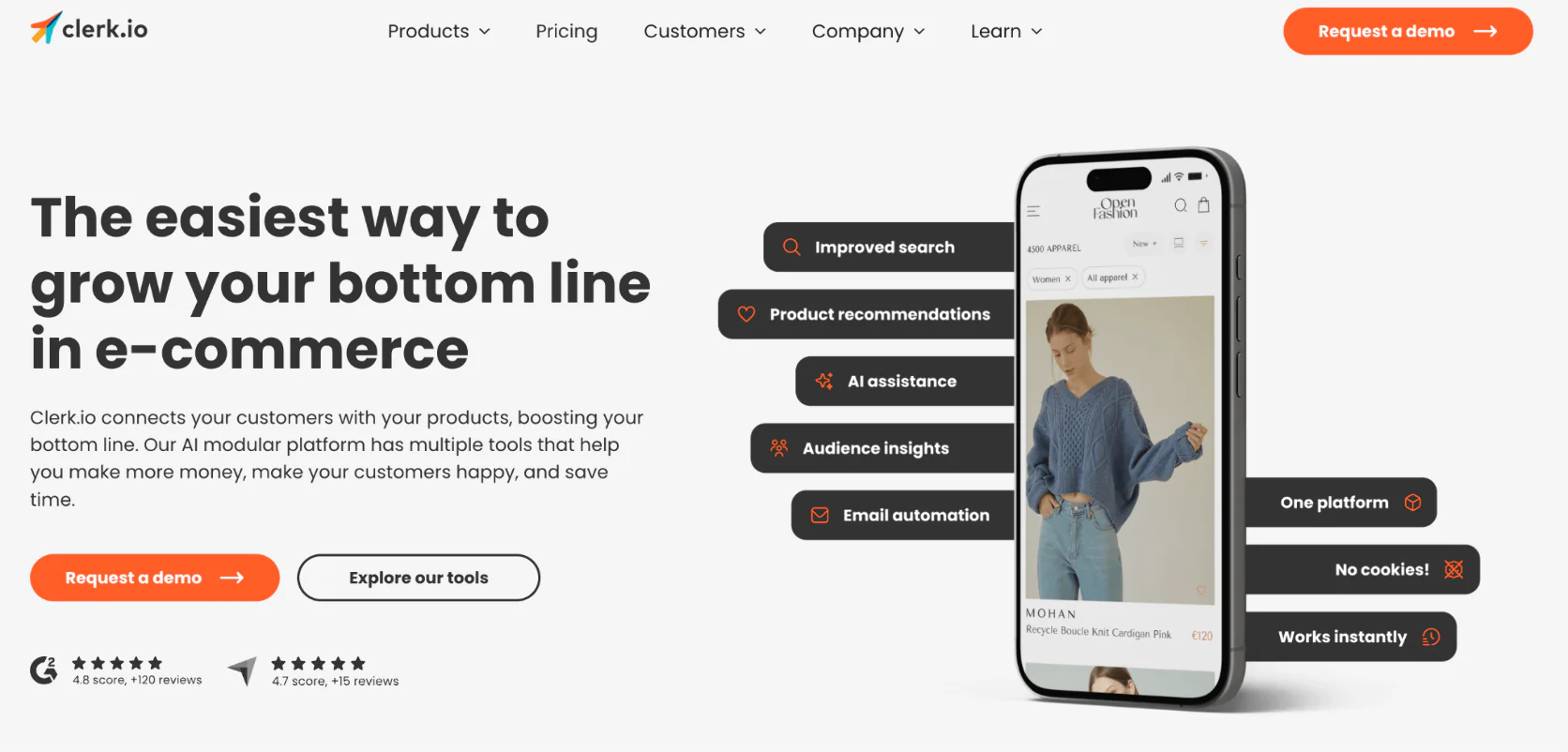 Clerk.io helps e-commerce businesses connect customers with products through AI-driven personalization. The product recommendation engine lifts shopping experiences by analyzing customer behavior and priorities to deliver tailored suggestions that increase conversion rates.