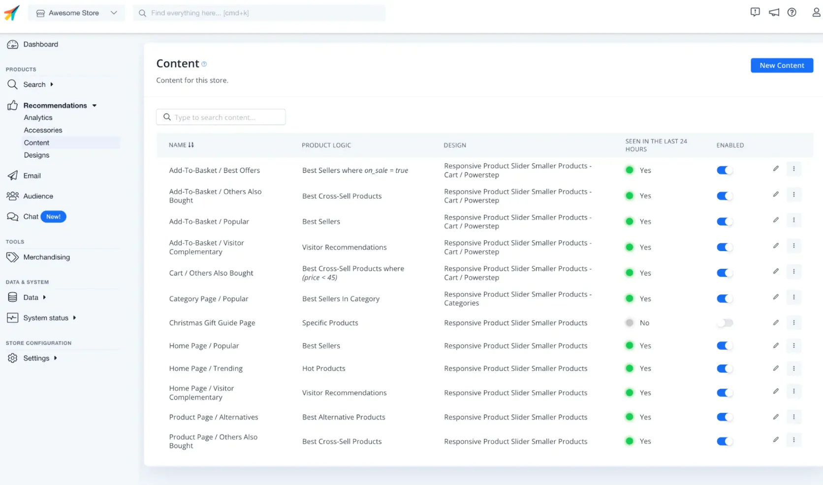 Nosto's merchandising rules give retailers granular control. They can boost or bury specific products in recommendation placements based on attributes like category, brand, size, price, and performance metrics. The platform supports many recommendation types such as best sellers, browsing history-related, and cross-sellers.
