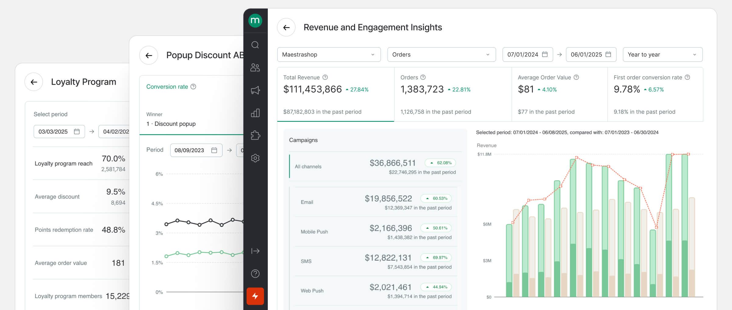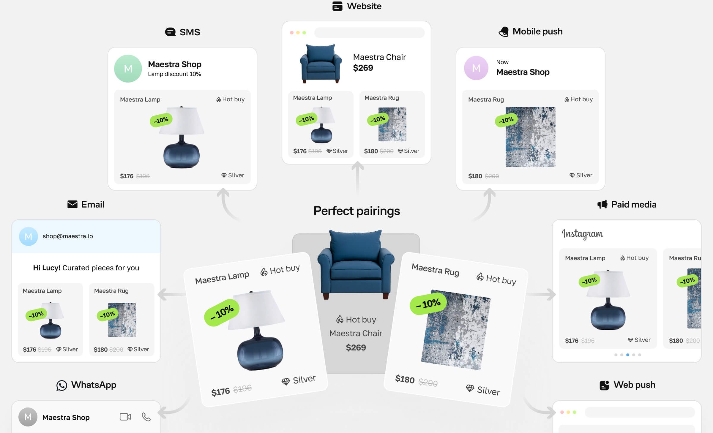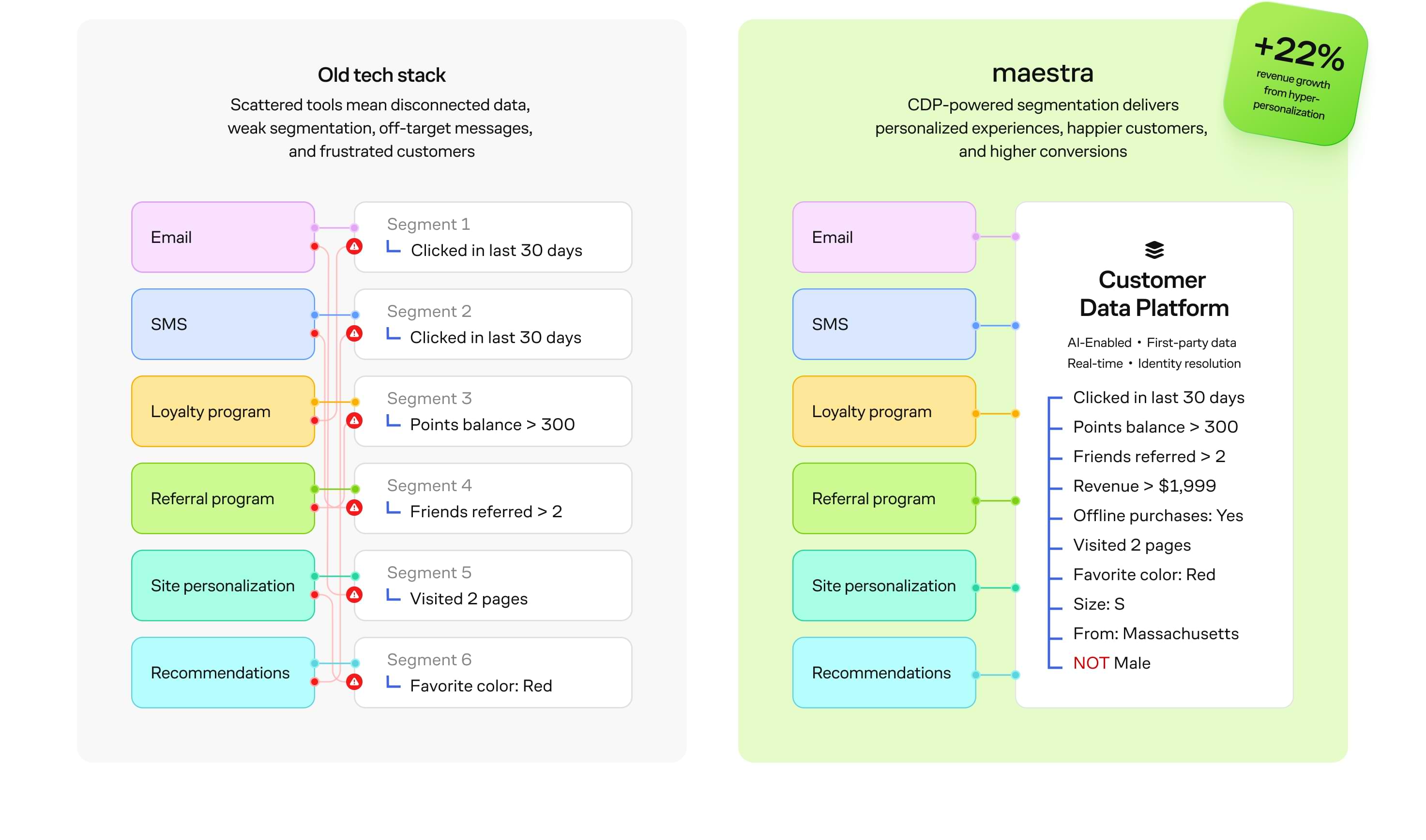 - All-in-one. Most CDPs only collect data. Maestra also includes email, SMS, push, site and app personalization, loyalty, referrals, promotions, product recommendations – even ad audiences. So you don’t need to juggle a dozen platforms.