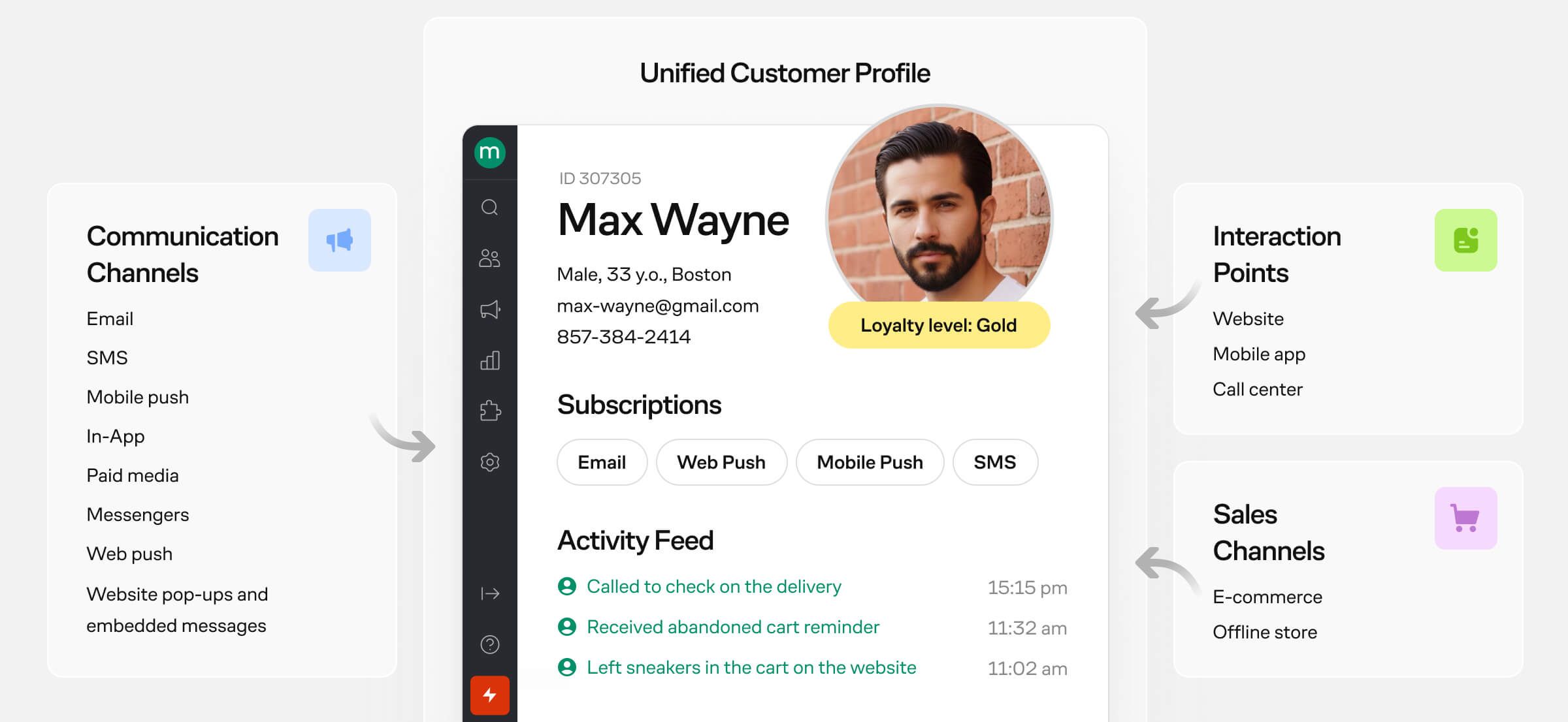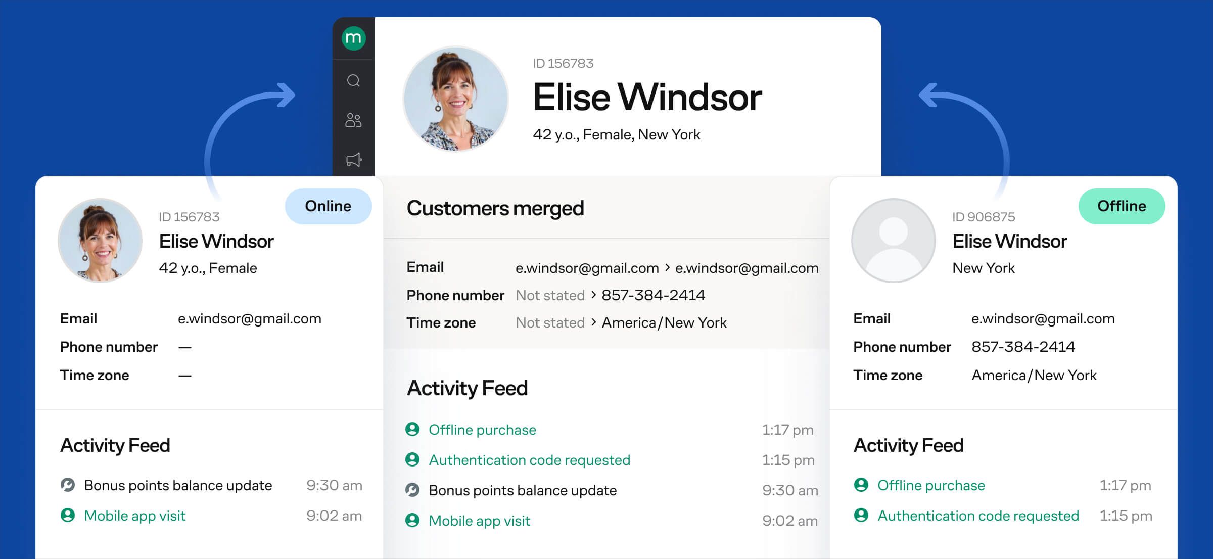 Create a seamless journey across your site, apps, stores, and marketing channels. Everything is synced in real time – offers, recommendations, loyalty, referrals, messages, preferences, product feeds, and delivery info
