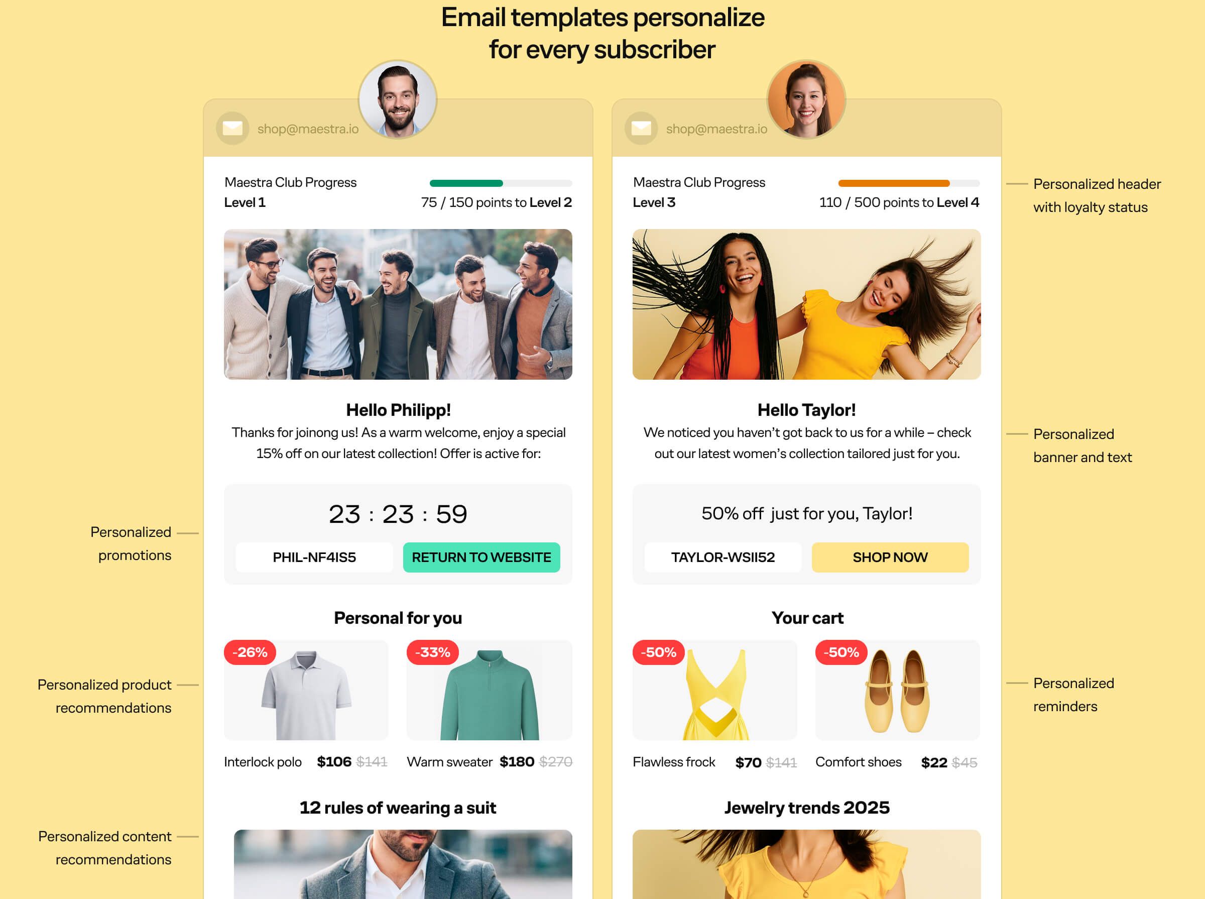 - Built for e-commerce. Unlike generic CDPs, Maestra is specifically designed for retail, offering seamless integration with e-commerce platforms, built-in support for product feeds, and ready-to-use custom and calculated fields – no dev time required.